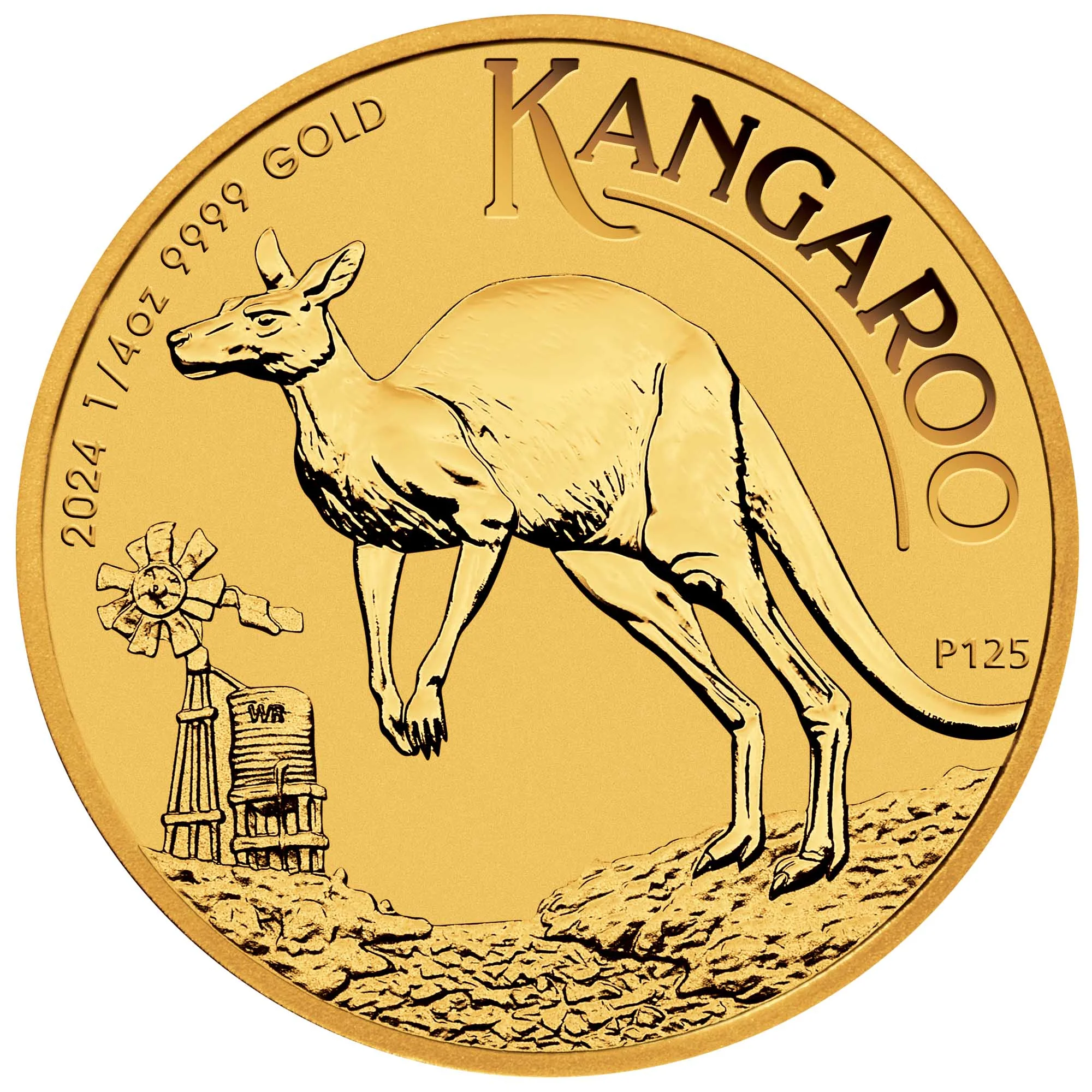 Large kangaroo leaping over a dry creek bed, windmill and tank behind.
