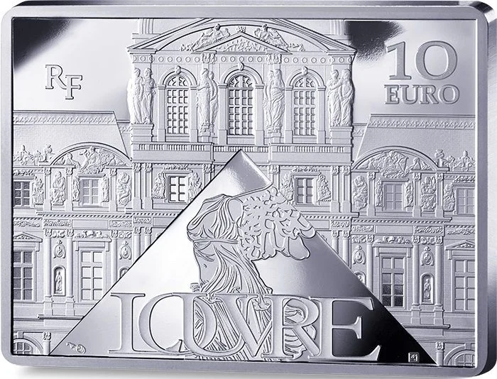 The Louvre Pyramid frames the Victory of Samothrace. The museum's name is below the pyramid, with "RF" and the coin's value above the palace roofs.