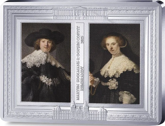 Busts of Marten Soolmans and Oopjen Coppit, separated by their names, painter, and date. The coin's border features their original portrait frames and the alternating museums of custody: the Louvre (top) and the Rijksmuseum (bottom).