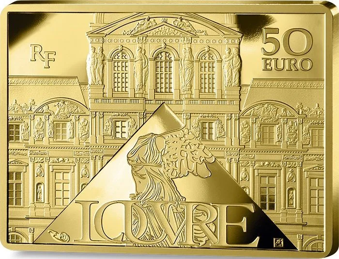 The Louvre Pyramid frames the Victory of Samothrace. The museum's name is below the pyramid, with "RF" and the coin's value above the palace roofs.