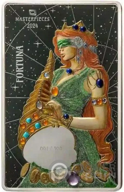 Fortuna, colourized, holding a cornucopia.