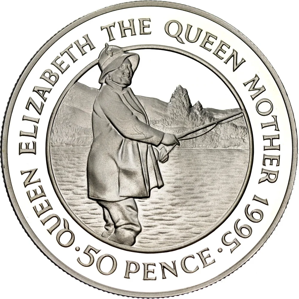 Queen Mother fishing in waders and hat, legend and date around, denomination below.
