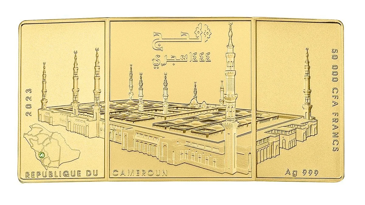 Masjid al-Nabawi in Medina, with its green dome and minarets. A map of Africa highlighting Cameroon.