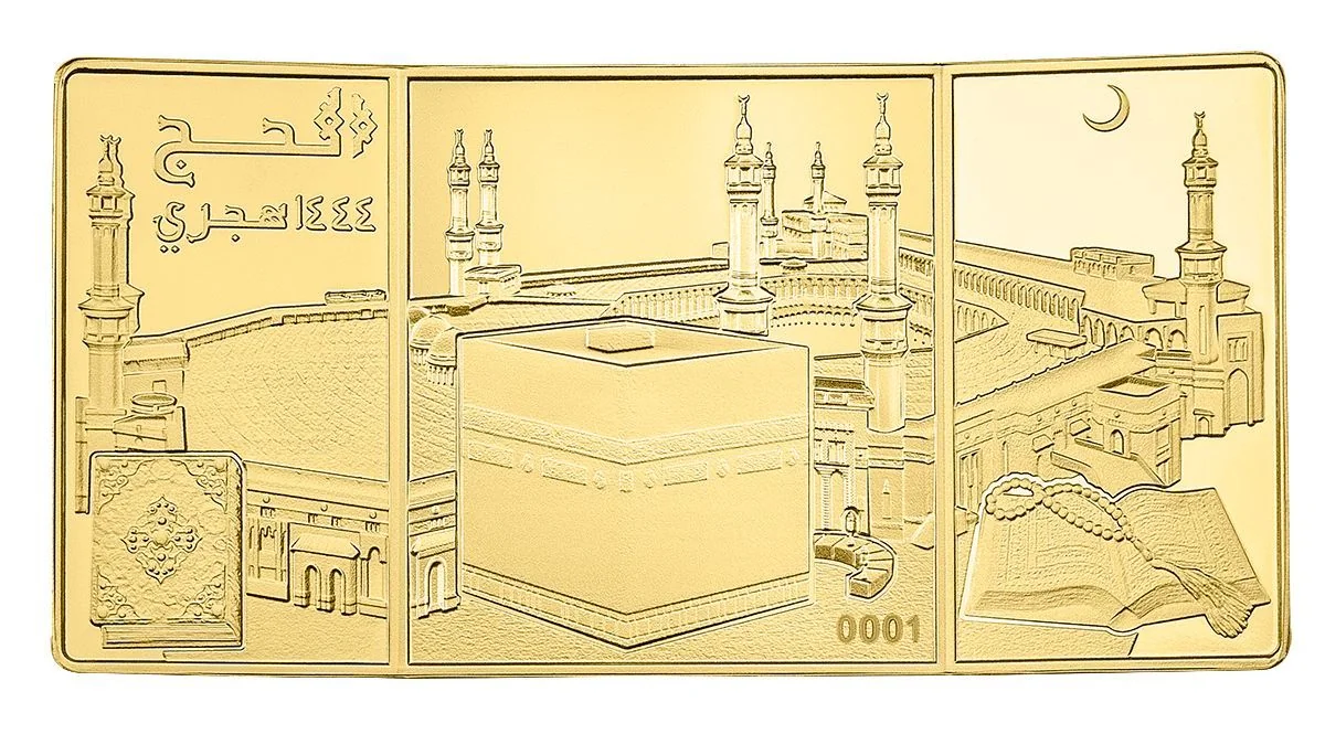 A detailed engraving of Mecca's Grand Mosque, centered on the Kaaba, with minarets and the inscriptions "Hajj" and the Hijri year 1444.