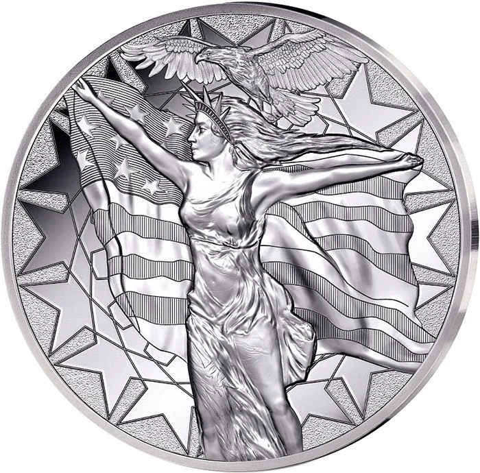 Lady Liberty, crowned and in a flowing gown, looks left with proud determination, holding the American flag aloft. An eagle flies beside her, while a multitude of intertwined stars in the background symbolize the union of the states.