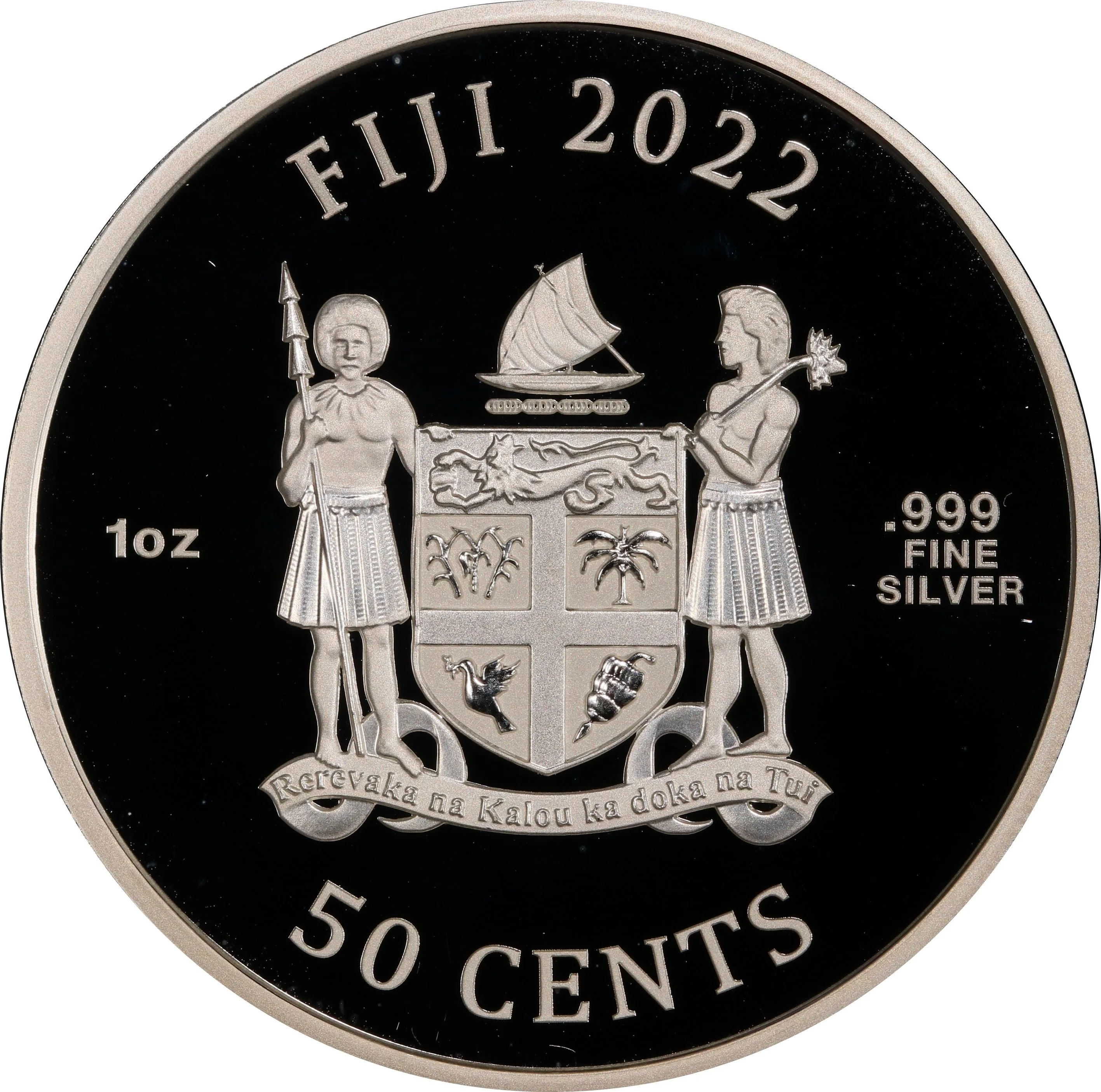 Fiji's coat of arms features a quartered shield displaying sugar cane, a coconut palm, a dove with an olive branch, and bananas. A lion holding a cocoa pod tops the shield, which is crowned by an outrigger canoe and supported by two Fijian figures.