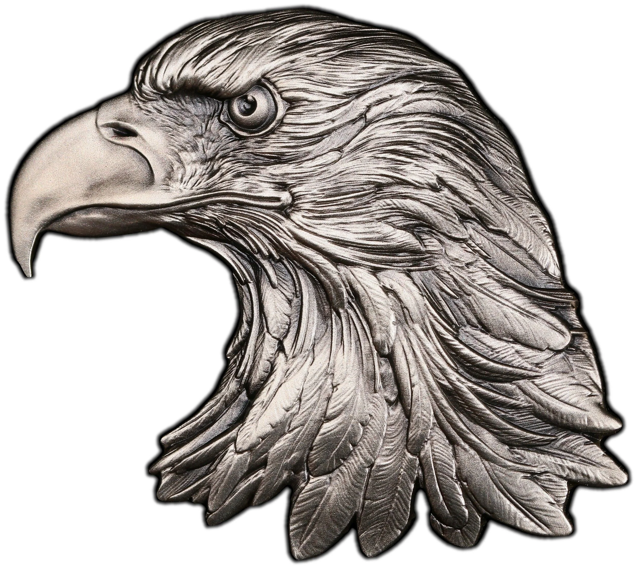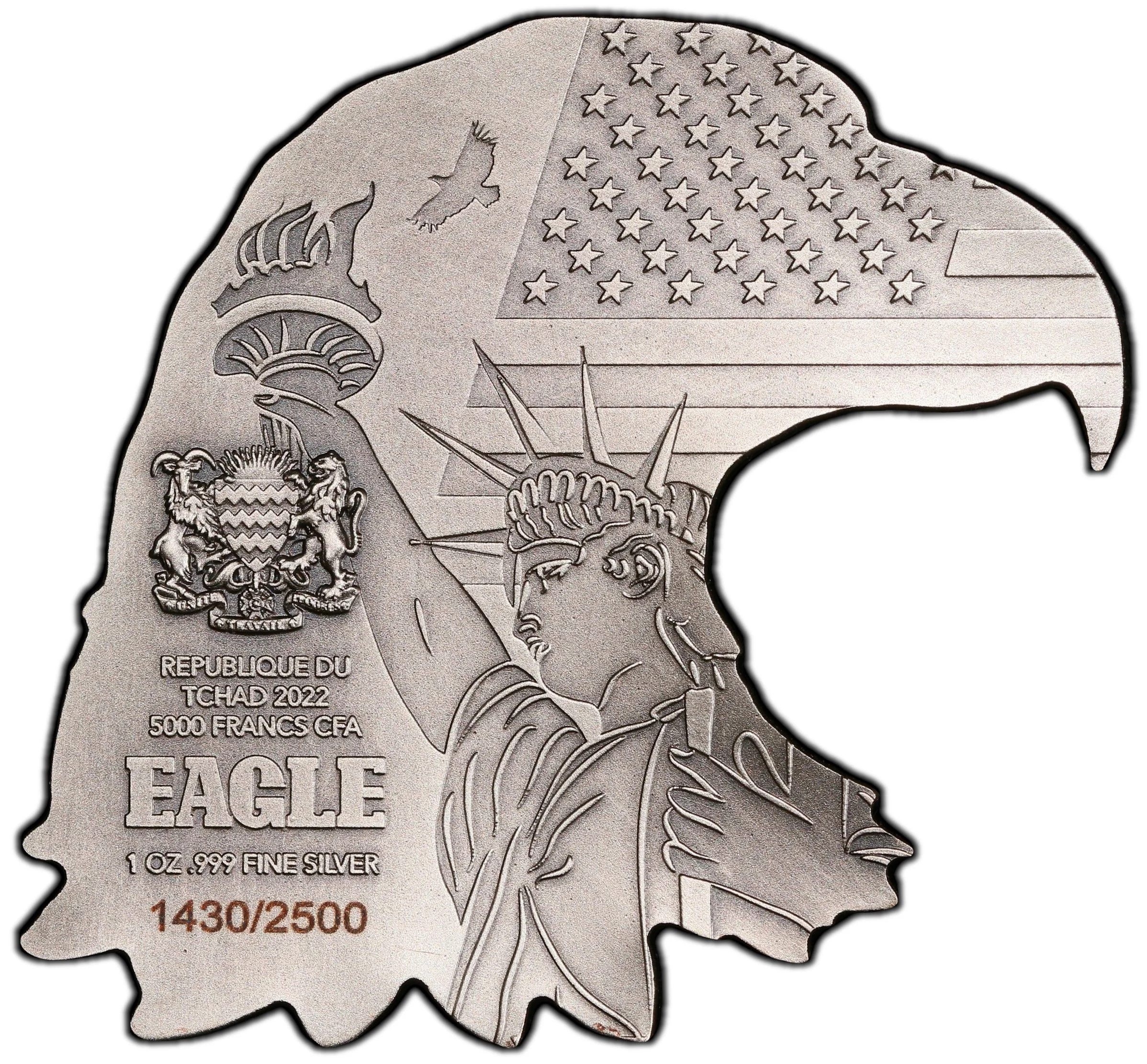 Description: Obverse: Statue of Liberty before an American flag, with a soaring eagle. To the right are Chad's Coat of Arms and inscriptions: "EAGLE," "REPUBLIQUE DU TCHAD," "2022," "5000 FRANCS CFA," "1OZ .999 FINE SILVER," and the coin's serial number.