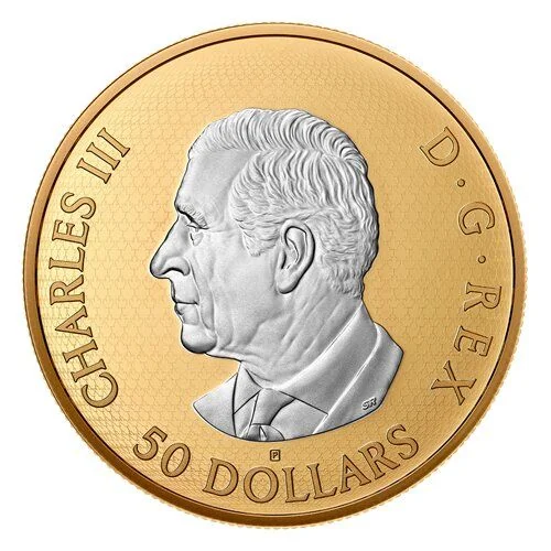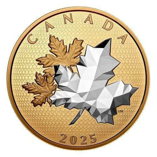 Your coin's reverse contrasts two traditionally engraved maple leaves with a third, multi-faceted leaf. The foreground leaf is unplated against a yellow-gold plated background, with a laser-engraved maple pattern filling the field.