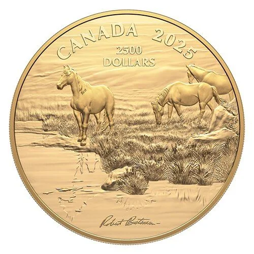 The reverse features Robert Bateman's "Mustang Country," depicting a stallion drinking at a slough, its reflection mirrored in the still water.