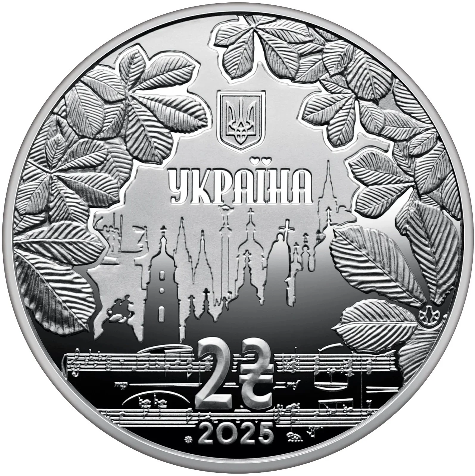 Stylized depiction of Kyiv's landscapes and landmarks, framed by symbolic chestnut leaves. Below, on a mirrored field: a musical staff with Igor Shamo's work, the denomination 2 ₴, and the year 2025.