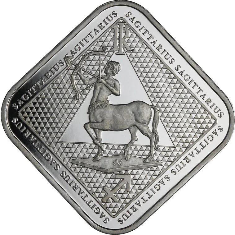 Central foreground: Sagittarius zodiac facing left, on an upward-pointing fire triangle. Background: repeating fire motif. Perimeter: "SAGITTARIUS". Top center: "RI" for Repubblica Italiana. Exergue: Sagittarius symbol. Within the fire cloud: designer's initials "AV" (Antonio Vecchio).