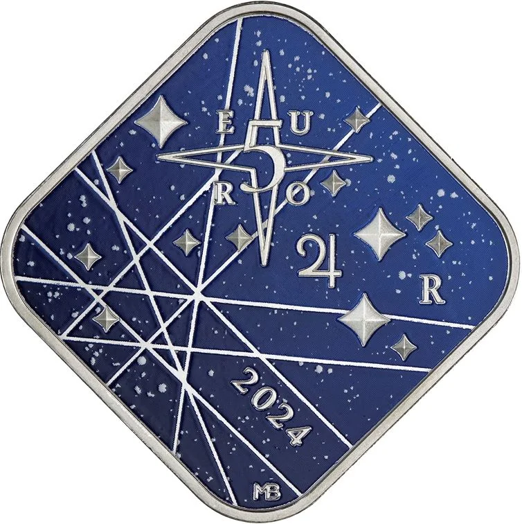 The Sagittarius constellation is highlighted in a night sky with intersecting lines. The left features Jupiter's symbol and a stylized "5 EURO" star. Below is the Rome Mint "R"; to the right, "2024" and the designer's initials "MB". A coloured coin.