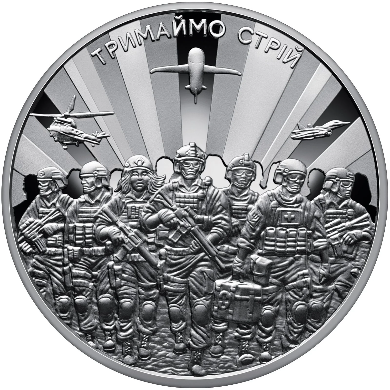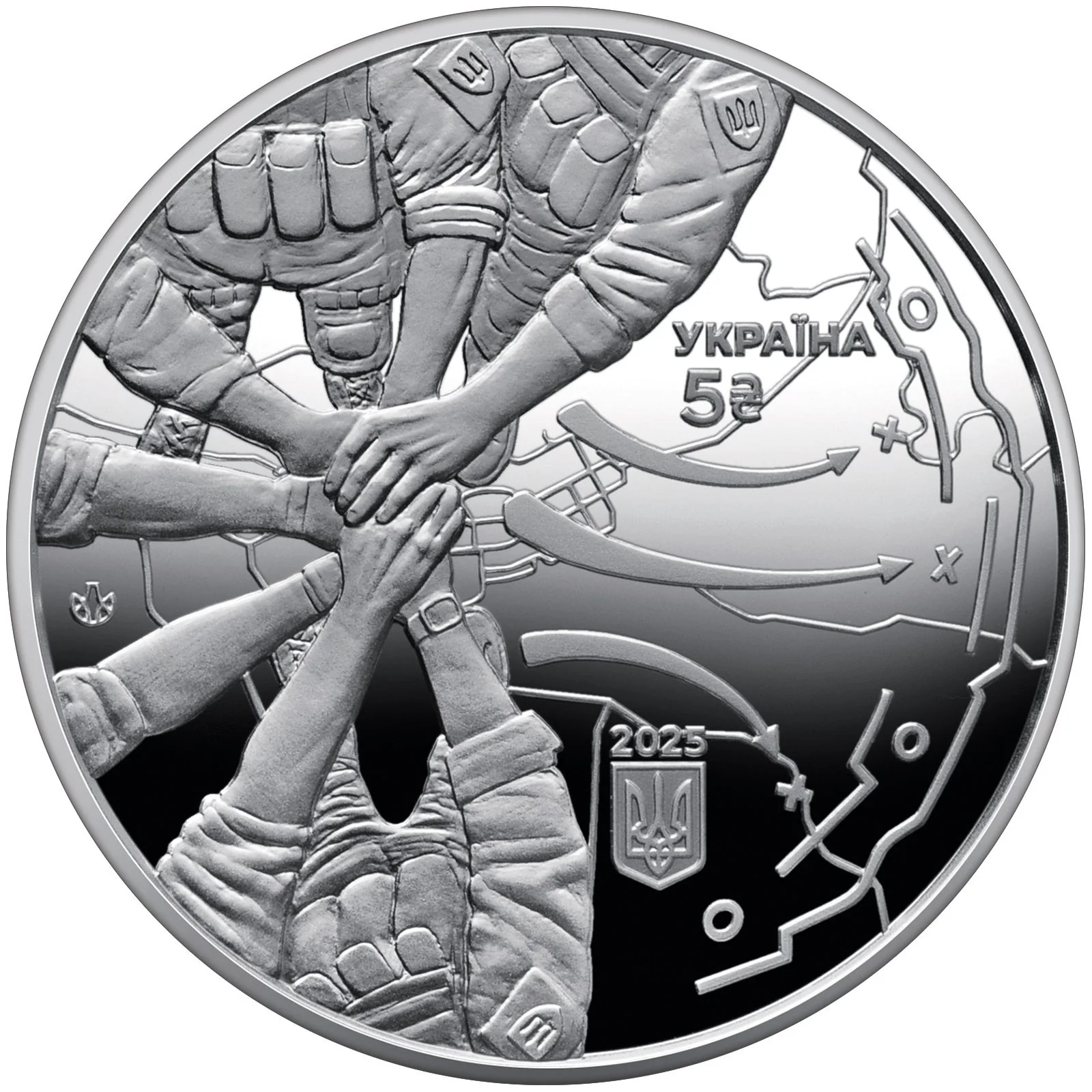 Ukrainian defenders unite in a circle, their handshake forming a symbol of solidarity over a topographic map where defensive lines shape a trident.