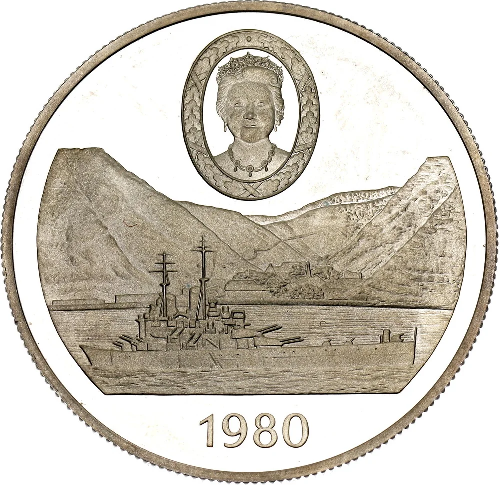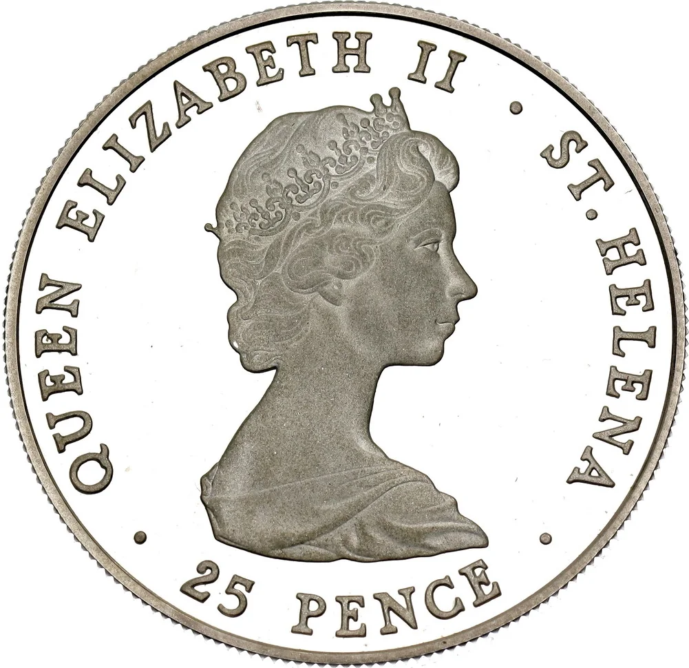 Portrait of the Queen Mother above St. Helena and HMS Vanguard.