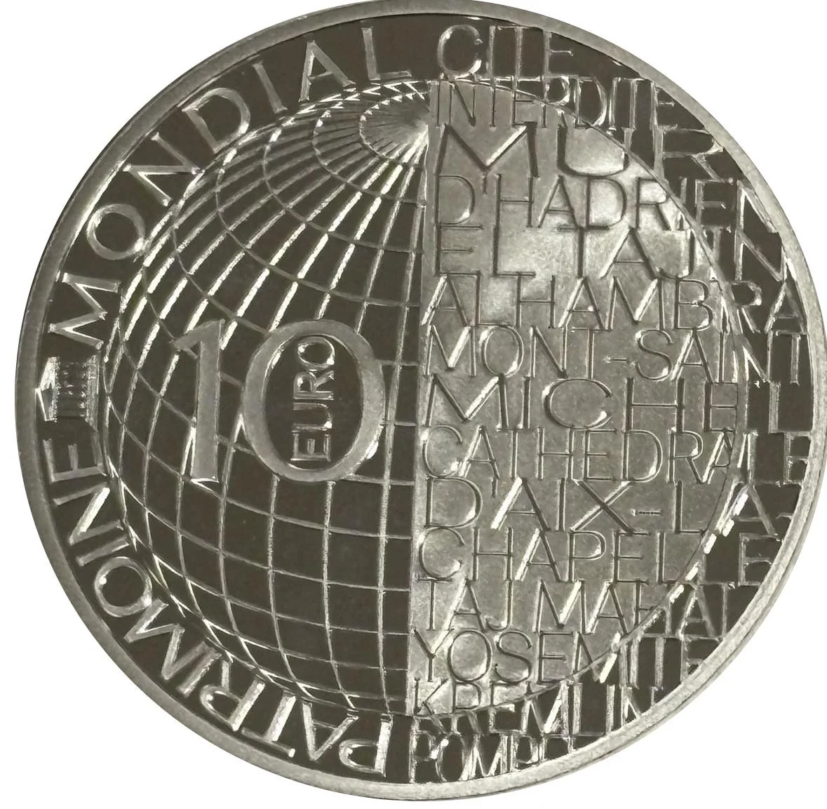 A UNESCO World Heritage globe, with site names on the right, the UNESCO logo on the left, and the face value inside. The reverse is a common design for the series.