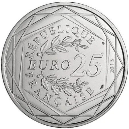 "EURO 25" between laurel and oak branches, encircled by "RÉPUBLIQUE FRANÇAISE", the year, and three hexagons.