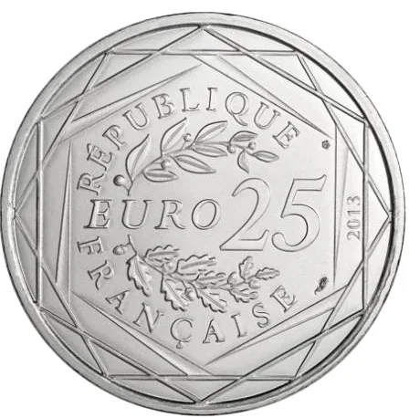 "EURO 25" between laurel and oak branches, encircled by "RÉPUBLIQUE FRANÇAISE", the year, and three hexagons.