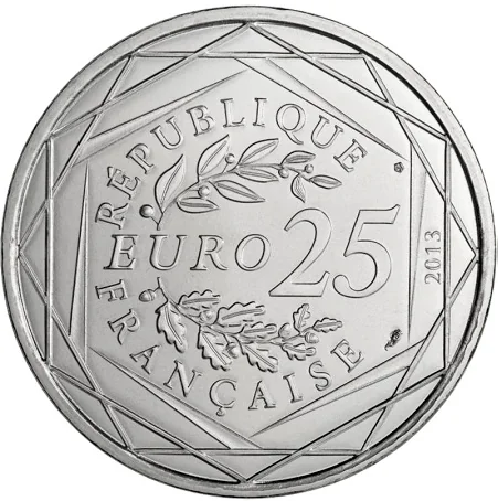 "EURO 25" between laurel and oak branches, encircled by "RÉPUBLIQUE FRANÇAISE", the year, and three hexagons.