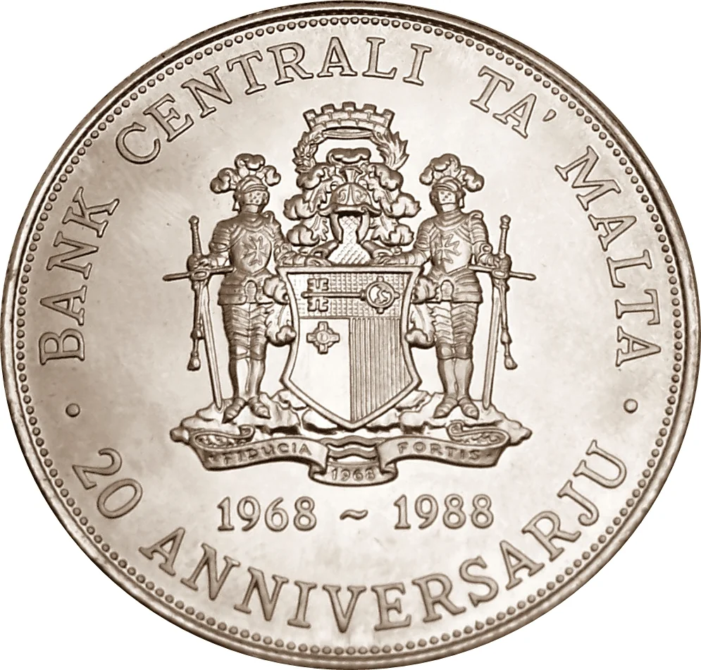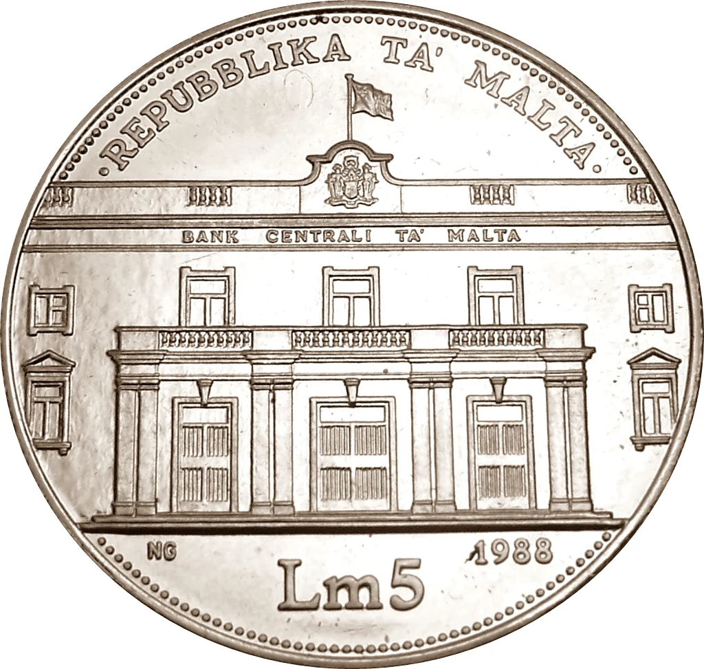 Crowned Central Bank of Malta coat of arms encircled by text.