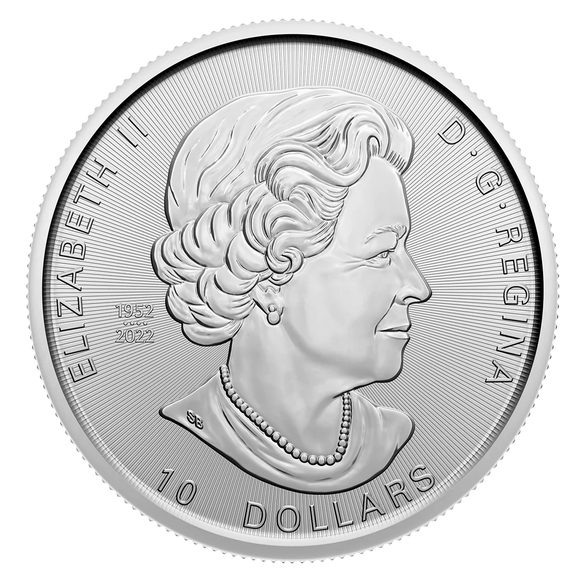 Queen Elizabeth II at 77, facing right, wearing a necklace and earrings. The effigy includes the dates 1952–2022 separated by four pearls, representing her four portraits on Canadian coins.