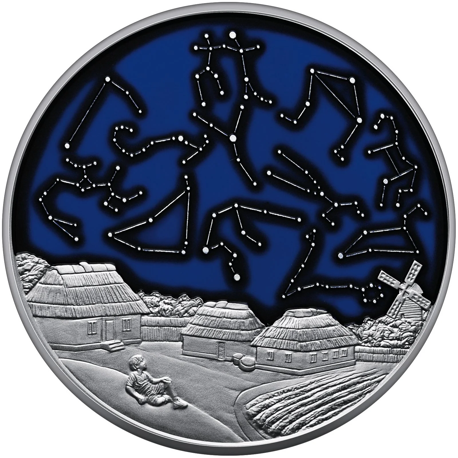Starry sky over a Ukrainian village with houses, gardens, and a windmill at dusk.