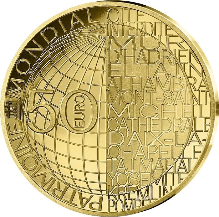 A UNESCO World Heritage globe, with site names on the right, the UNESCO logo on the left, and the face value inside. The reverse is a common design for the series.