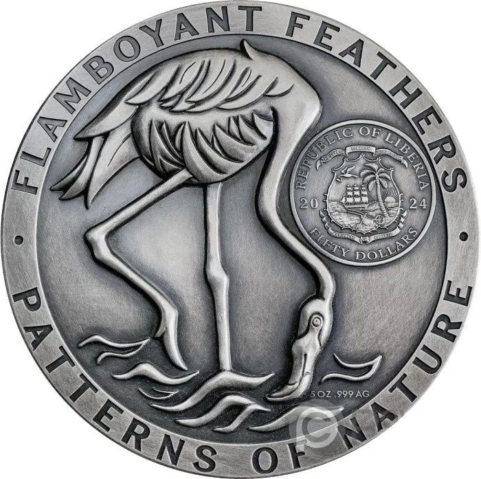 Description: Flamingo drinking, Liberia's coat of arms in a circle on the right.