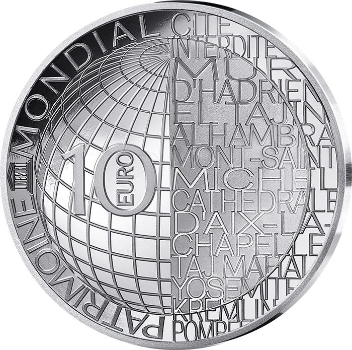 A UNESCO World Heritage globe, with site names on the right, the UNESCO logo on the left, and the face value inside. The reverse is a common design for the series.