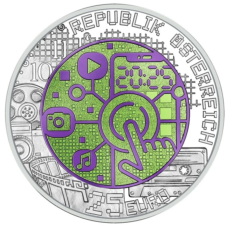 Description: The outer ring shows analog items like letters, phones, books, and gears. Their digital counterparts—a cloud, call icon, pixelated book, and robot—are in the green-purple core. A microchip with "KI" connects everything at the center.