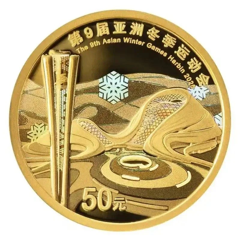 The torch for the 9th Asian Winter Games features the Harbin Grand Theatre, the main venue, alongside subtly colored snowflakes.