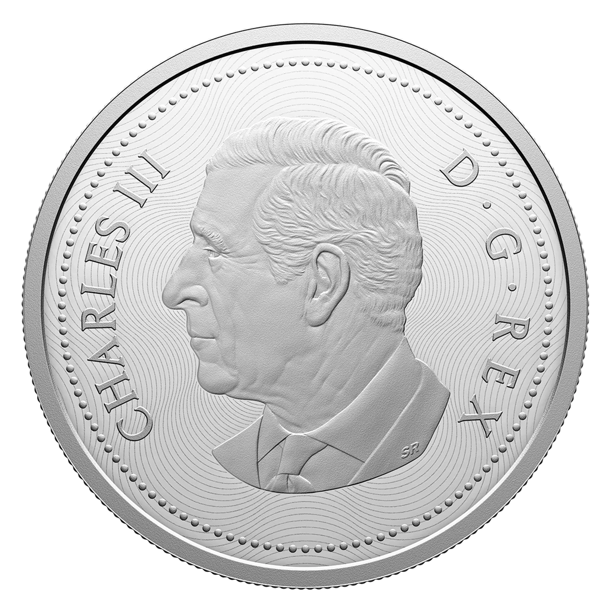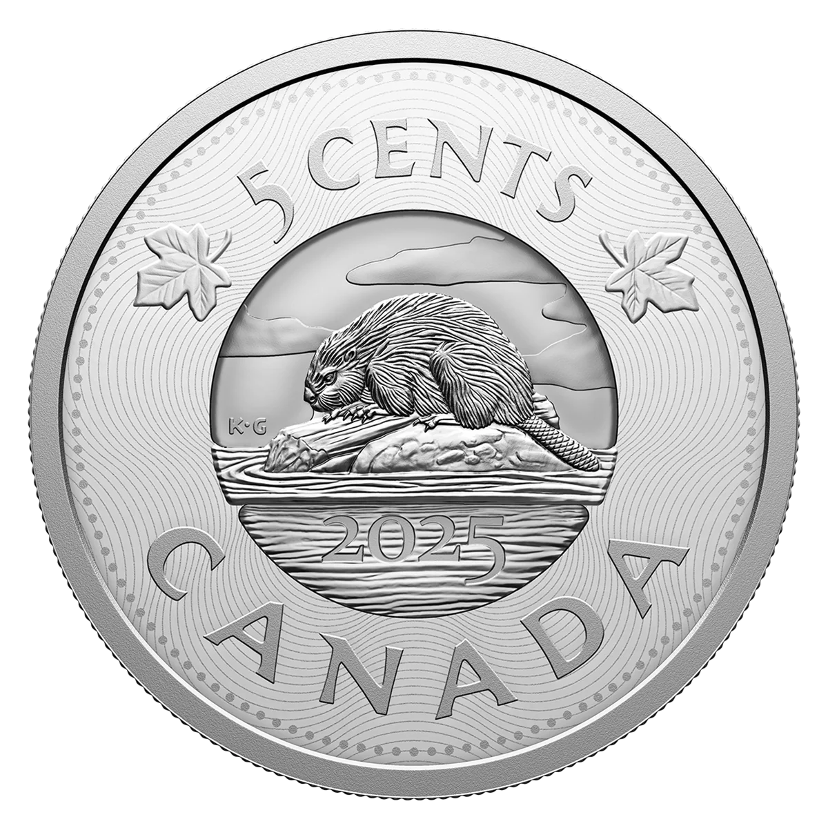 This coin's reverse reimagines G. E. Kruger Gray's classic five-cent design in multiple layers. The top plate features "5 CENTS" and "CANADA," while cut-outs around the central beaver reveal engraved clouds, water, and the year "2025" on the surface beneath.