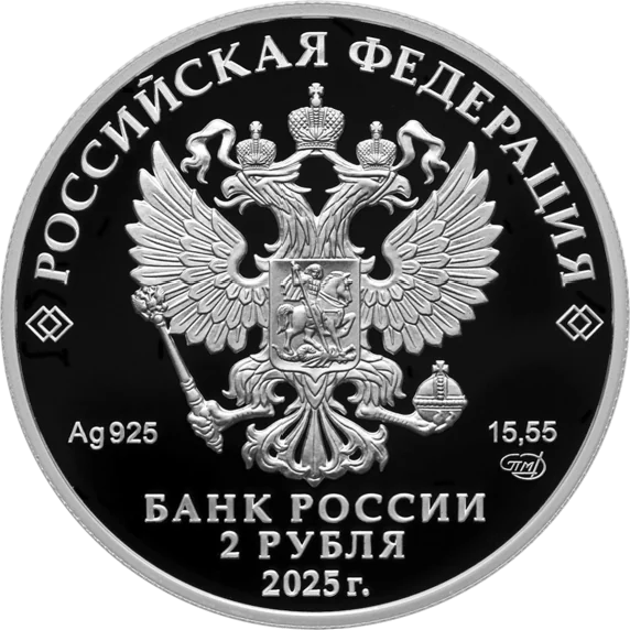 The obverse features the Russian Federation coat of arms with "РОССИЙСКАЯ ФЕДЕРАЦИЯ" above, framed by diamonds. Below are the metal details and mint mark flanking the emblem, with "БАНК РОССИИ", "2 РУБЛЯ", and "2025 г." inscribed at the bottom.