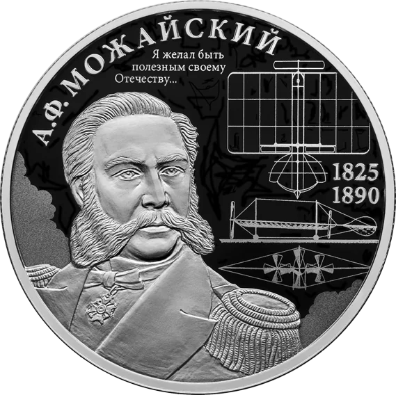 The reverse features a portrait of Alexander Mozhaisky, with laser-matte aircraft drawings and clouds. Inscriptions include ‘А.Ф. МОЖАЙСКИЙ’ above, ‘1825’ and ‘1890’ on the right, and a partial quote ‘Я желал быть полезным своему Отечеству...’ at the top, also laser-matte.