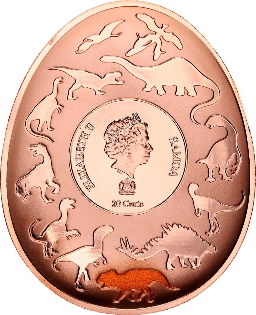 Queen Elizabeth II's effigy within a circle, above a small Samoa coat of arms, surrounded by silhouettes of the series' dinosaurs with this coin's dinosaur gold-plated.