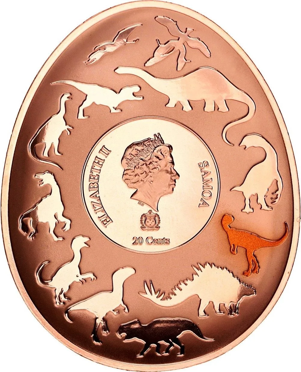 Queen Elizabeth II's effigy within a circle, above a small Samoa coat of arms, surrounded by silhouettes of the series' dinosaurs with this coin's dinosaur gold-plated.