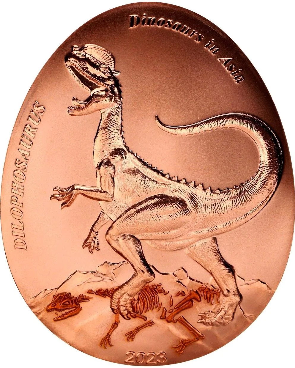 Dilophosaurus walking left over gilded bones on a mountain, with a date below.