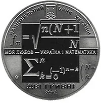 The obverse features Ukraine's Small Coat of Arms with the inscription "НАЦІОНАЛЬНИЙ БАНК УКРАЇНИ." Centered is a segment of a formula by M.P. Kravchuk, encircling his statement "МОЯ ЛЮБОВ - УКРАЇНА І МАТЕМАТИКА." Below are the face value "ДВІ ГРИВНІ," the year 2012, and the Mint's logo.