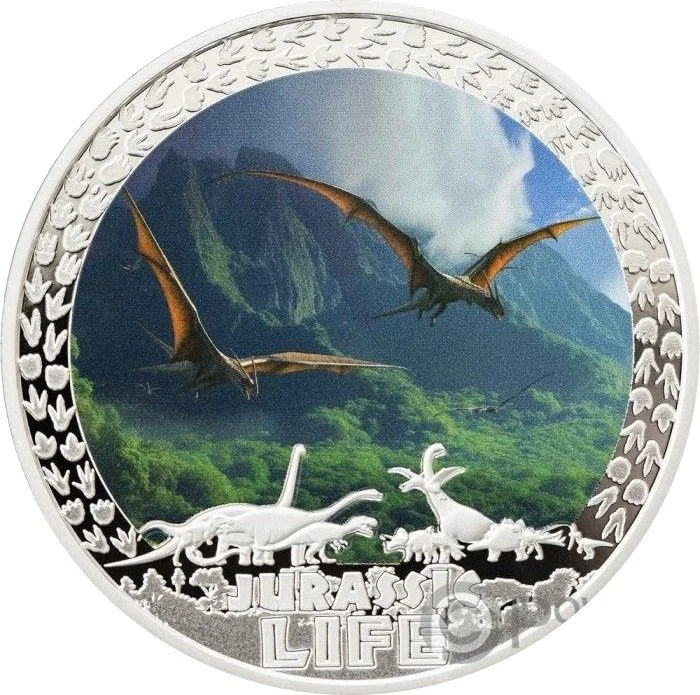 Coat of arms divides date, country name above, value and details below. Dinosaurs surround.