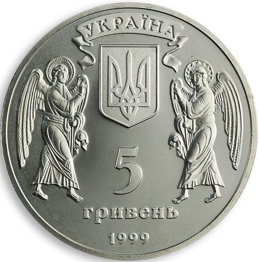 Ukraine’s small National Emblem is flanked by two angels, with the inscription: УКРАЇНА 5 / ГРИВЕНЬ / 1999.