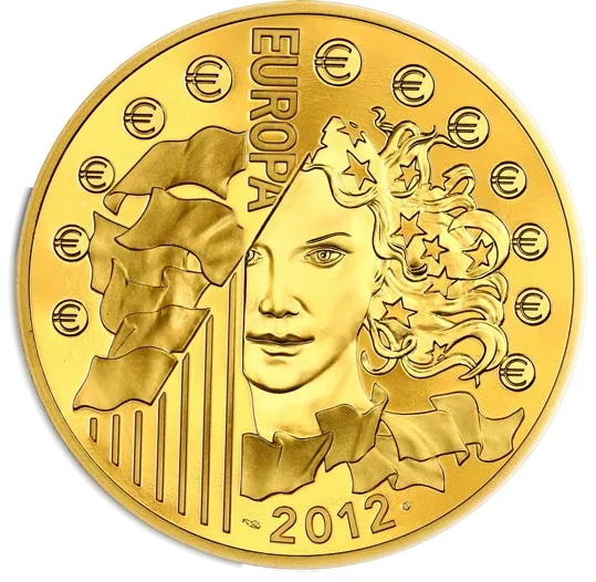 Portrait of the goddess Europa with stars in her hair, above an arc of 12 "€" symbols. To her left, European flags on mats.