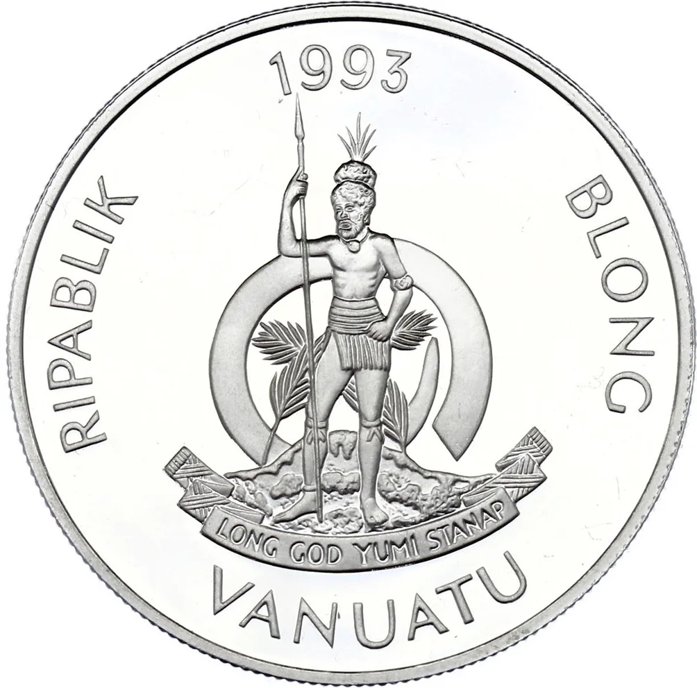 Vanuatu coat of arms with a Melanesian warrior, a boar's tooth, and the motto "LONG GOD YUMI STANAP". Value above.