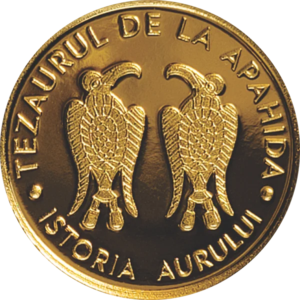 Apahida Treasure eagle saddle appliques and the inscriptions “TEZAURUL DE LA APAHIDA” and “ISTORIA AURULUI”.