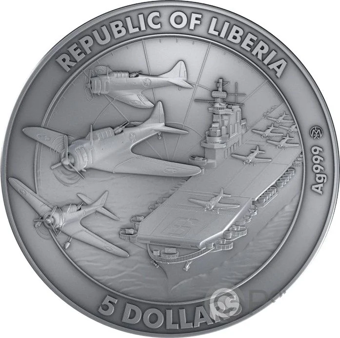 A Dauntless flies high before a stars and stripes backdrop. Below, one Zero falls with a broken engine while another is chased by a Wildcat. The IJN Kaga burns and sinks near the USS Yorktown.