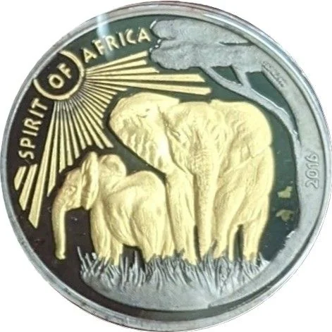 Description: The reverse features a gilded elephant mother and calf in their habitat, with the "SPIRIT OF AFRICA" series sign to the left and small gilded bull and bear figures to the right. The left edge is stamped with "1OZ AG .999" and "2016".