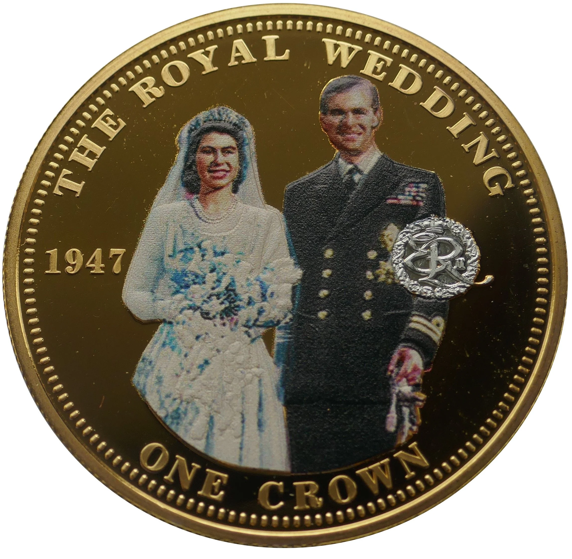1947 wedding portrait of Queen Elizabeth II and the Duke of Edinburgh, with royal cypher and value.