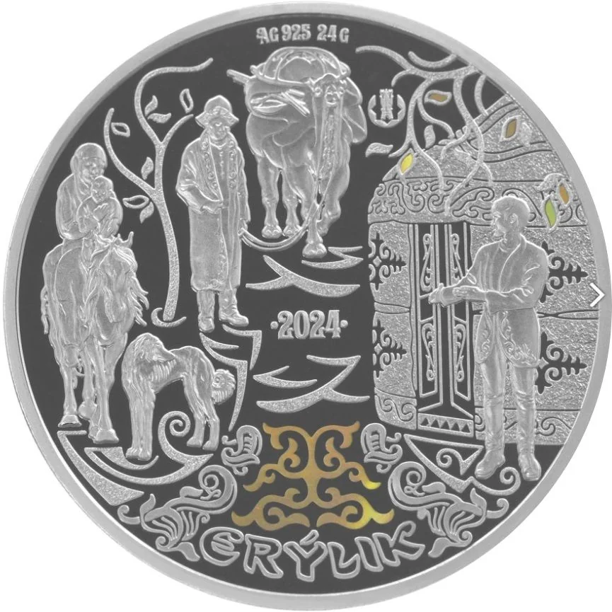 Description: The reverse shows fragments of Kazakh traditions: a man greeting at a yurt, a loaded camel, a woman with a child on horseback, a dog, and a man in national dress. National patterns fill the field, with the metal, fineness, and weight above, the issue year in the center, and "ERÝLIK" below.