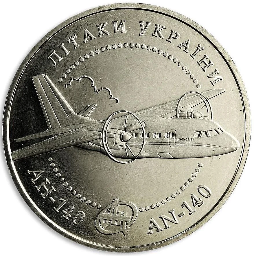 The coin depicts an AN-140 aircraft. Between the outer rim and beaded circle are circular inscriptions: "ЛІТАКИ УКРАЇНИ" above and "АН-140" / "AN-140" below, flanking the AN logo.