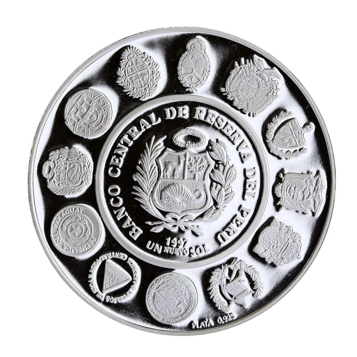 Description: Peru's coat of arms, value, and year within a lined circle, ringed by 12 Ibero-American national shields.