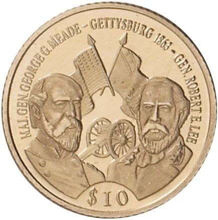 Busts of Generals Meade and Lee, artillery, and Union and Confederate flags.