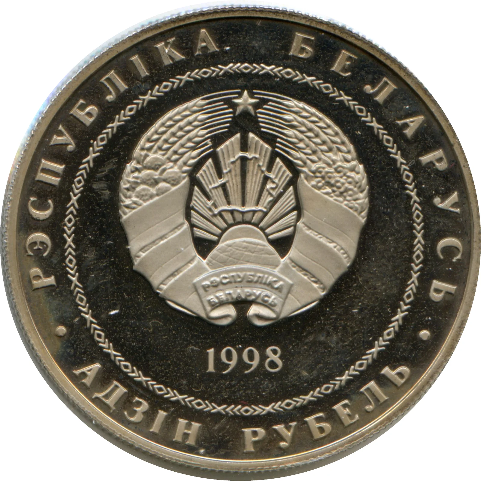 Circular ornament with relief State Coat of Arms. Below: year. Rim inscriptions: "РЭСПУБЛІКА БЕЛАРУСЬ" above, "АД3ІН РУБЕЛЬ" below.